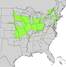 Rare in the South, it is more common in the northern United States.[3] In the United States, it occurs in Alabama, Arkansas, Connecticut, Delaware, the District of Columbia, Florida, Georgia, Iowa, Illinois, Indiana, Kansas, Kentucky, Louisiana, Massachusetts, Maryland, Maine, Michigan, Minnesota, Missouri, North Carolina, North Dakota, Nebraska, New Hampshire, New Jersey, New York, Ohio, Oklahoma, Pennsylvania, Rhode Island, South Carolina, South Dakota, Tennessee, Virginia, Vermont, Wisconsin and West Virginia; the species also occurs in Ontario and Quebec in Canada.[9] The species is listed as Endangered in Florida, Maryland, and New Hampshire; and as Special Concern in Tennessee.[9]