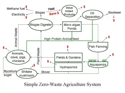 The integration of shallow oxidisation ponds of microalgae was demonstrated by Golueke & Oswald in the 1960s. The widespread global implementation of these systems can be largely credited to Prof George Lai Chan-Yu-Thim (02 March 1924 Mauritius-08 October 2016 Mauritius) from ZERI.[2] Zero waste agriculture is now practiced in China (ecological farming), Columbia (integrated food & waste management systems) & Fiji (integrated farming systems), India (integrated biogas farming), South Africa (BEAT Coop & African Agroecological Biotechnology Initiative) and Mauritius. The Brazilian government has adopted integrated farming system as a major social technology for the uplifting of marginalized and subsistence farmers through coordination with TECPAR.[3]
