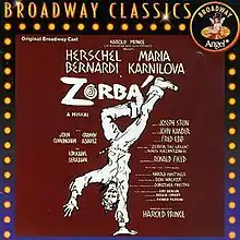 Zorba is a musical with a book by Joseph Stein, lyrics by Fred Ebb, and music by John Kander. Adapted from the 1946 novel Zorba the Greek by Nikos Kazantzakis and the subsequent 1964 film of the same name, it focuses on the friendship that evolves between Zorba and Nikos, a young American who has inherited an abandoned mine on Crete, and their romantic relationships with a local widow and a French woman, respectively.