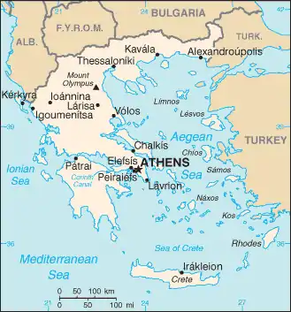 | Administrative divisions: | 51 prefectures (nomoi, singular - nomos) and 1 autonomous region*; Agion Oros* (Mt. Athos), Achaia, Aitolia kai Akarmania, Argolis, Arkadia, Arta, Attiki, Chalkidiki, Chanion, Chios, Dodekanisos, Drama, Evros, Evrytania, Evvoia, Florina, Fokidos, Fthiotis, Grevena, Ileia, Imathia, Ioannina, Irakleion, Karditsa, Kastoria, Kavala, Kefallinia, Kerkyra, Kilkis, Korinthia, Kozani, Kyklades, Lakonia, Larisa, Lasithi, Lefkas, Lesvos, Magnisia, Messinia, Pella, Pieria, Preveza, Rethynnis, Rodopi, Samos, Serrai, Thesprotia, Thessaloniki, Trikala, Voiotia, Xanthi, Zakynthos |