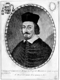 Arms of Alexander VIIIn the Rome of Renaissance times, an ancestor of Alexander VII was known as the "Magnificent". The future Pope's father, Flavio Chigi, nephew of Pope Paul V, though not as prosperous as his forebears, gave his son a suitable training. The latter owed much also to his mother, a woman of singular power and skill in the formation of youth. The youth of Fabio was marked by continued ill-health, consequent upon an attack of apoplexy in infancy. Unable to attend school, he was taught first by his mother, and later by able tutors, and displayed remarkable precocity and love of reading. In his twenty-seventh year, he obtained the doctorates of philosophy, law, and theology in the University of Sienna, and in December, 1626, he entered upon his ecclesiastical career at Rome. In 1627 he was appointed by Urban VIII Vice-Legate of Ferrara, and he served five years under the Cardinals Sacchetti and Pallotta, whose commendations won for him the important post of Inquisitor of Malta, together with the episcopal consecration. In 1639 he was promoted to the nunciature of Cologne; and in 1644 was made envoy extraordinary of Innocent X to the conference of Münster, in which post he energetically defended papal interests during the negotiations that led, in 1648, to the Peace of Westphalia. (See Thirty-Years' War.) Innocent X called him to Rome in 1651 to be his secretary of state, and in February, 1652, made him Cardinal. In the conclave of 1655, famous for its duration of eighty days, and for the clash of national and factional interests, Cardinal Chigi was unanimously elected Pope. The choice was considered providential. At a time when churchmen were being forced to realize the deplorable consequences, moral and financial, of nepotism, there was needed a pope who would rule without the aid of relatives. For a year the hopes of Christendom seemed to be realized. Alexander forbade his relatives to come to Rome. His own sanctity of life, severity of morals, and aversion to luxury made more resplendent his virtues and talents. But in the consistory of 24 April, 1656, influenced by those who feared the weakness of a papal court unsustained by ties of family interest, he proposed to bring his brother and nephews to assist him. With their advent came a marked change in the manner of life of the pontiff. The administration was given largely into the hands of his relatives, and nepotic abuses came to weigh as heavily as ever upon the papacy. The endeavours of the Chigi to enrich their family were too indulgently regarded by the Pope; but, ever pious and devout, he was far from having a share in the excesses of his luxury-loving nephews. His burden being in this way lightened, he passed much of his time in literary pursuits and in the society of the learned; but the friends whom he favoured were those who could be best relied on as counsellors.