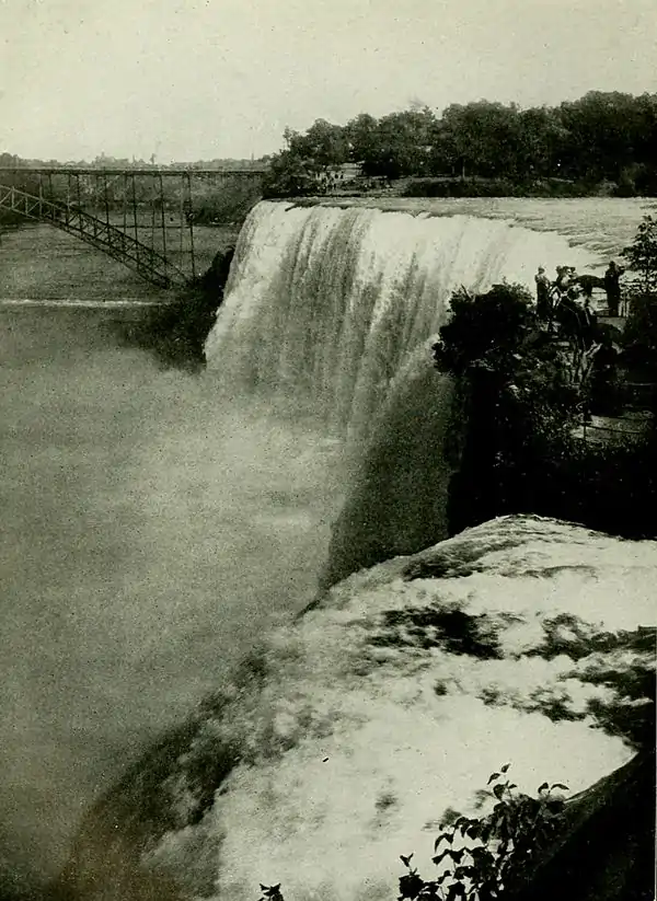 NIAGARA FALLS. The Niagara river, which flows from Lake Erie N. into Lake Ontario, is about 36 miles in length; its descent from the level of one lake to that of the other is about 334 feet. At the foot of Grand Island, which reaches within 1½ miles of the Falls, the river is contracted to a width of 2½ miles, and grows narrower as it proceeds. By this, and by the descent in the channel, which is about 60 feet in the mile, are produced the swift currents known as the rapids, in which the river, notwithstanding its great depth, is perpetually white with foam. At the Falls, which are 22 miles from Lake Erie, the river is divided by an island called Goat Island; but, in consequence of a bend in the channel, by far the largest portion of the water is sent down by the Canadian side. On this side, therefore, is the grander cataract, which has been named the Horseshoe Fall, and which is about 600 yards in width and 154 feet high. The water is so deep that it retains its green color for some distance below the brow of the precipice; and it rushes over with such force that it is thrown about 50 feet from the foot of the cliff. The separation caused by Goat Island leaves a large wall of rock between the Canadian and American falls, the latter being again divided by an islet at a short distance from Goat Island. This fall is from 8 to 10 feet higher than the Horseshoe, but only about 220 yards wider. The Falls can be seen from below on both sides, and every facility is given for viewing them from all the best points. The river is crossed by a suspension bridge, and by a ferry about 200 or 300 yards below the Falls, where it is 1,200 yards wide. A stratum of a rock runs across the direct course of the river, 3 or 4 miles below, which, after forming a vast circular basin, with an almost impassable whirlpool, is forced away at right angles to its old channel.