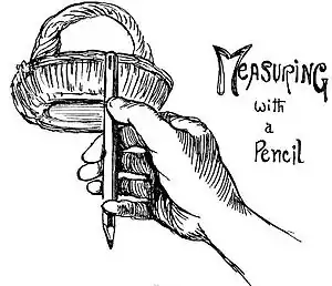 Let us presume that you are drawing a simple subject such as a small basket and you are in doubt as to whether the depth of your drawing of the basket is too great for its width. Hold your pencil at arm's length and mark the depth with your thumb. Swivel your wrist, keeping your thumb in the same position on the pencil, and place it in mid-air on the outside edge of the basket, measuring the width and counting: "once," then shifting, "twice," again shifting, "thrice" (probably not quite three times).