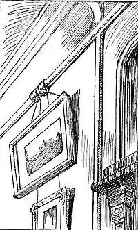 Lay the thread first against the lowest line of the left wall, and find the inclination of the floor; then lay it on the top line near the ceiling. You will easily discover the point where these two lines meet. Hold the thread on that place and test the right-hand side of the picture by laying the thread first against the base and then against the summit of the pillars.