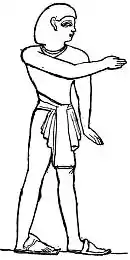 The head in profile, the shoulders squarely and flatly presented (front view), the legs apparently tacked on to a flat surface instead of a rounded body, for they do not recede one behind the other, but present knee against knee-joint, ankle against ankle, and foot against foot. And to add to the peculiarities of early Egyptian art, the front view of the eye is inserted along the profile view of the forehead, nose, mouth, and chin.