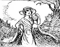 draw the single figure of a girl. We sketch her in a single position, standing with her arms to her sides, and more bulk at the head than at the base; how silly she looks—how meaningless! But give some reason for this particular picture—the flowing of a scarf, the widening of the design at the base, an uplifted arm holding a basket, clouds floating behind her head, and sloping banks on either side. Then the eye is caught first by the central figure, next by the shawl, arm, clouds, and led at last to the banks and trees.