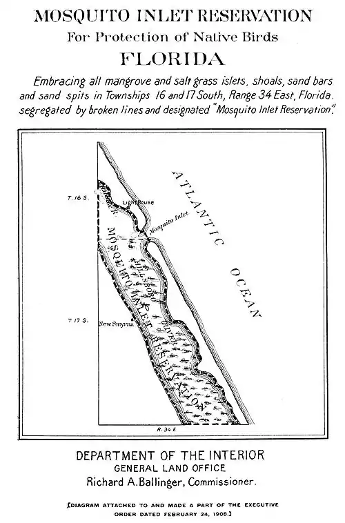 It is hereby ordered that all small mangrove and salt grass islets, shoals, sand bars and sand spits, situated in Mosquito Inlet, and in and near the mouths of the Halifax and Hillsboro rivers, in townships sixteen and seventeen south, range thirty-four east of the Tallahassee meridian, Florida, and located within the area segregated by a broken line, and shown upon the diagram hereto attached and made a part of this order, are hereby reserved and set aside for the use of the Department of Agriculture as a preserve and breeding ground for native birds. This reservation to be known as the Mosquito Inlet Reservation.