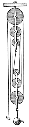 Let us begin with the second system of pulleys. Here we have a power P attached to the one end of a thread, which passes