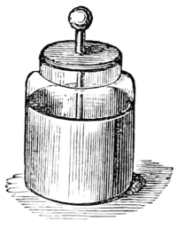 In this case, an instrument called a Leyden jar is very frequently employed. It consists of a glass jar, coated inside and outside with tin foil, as in Fig. 7. A brass rod, having a knob at the end of it, is connected metallically with the inside coating, and is kept in its place by being passed through a cork, which covers the mouth of the jar. We have thus two metallic coatings which are not electrically connected with one another. Now, in order to charge a jar of this kind, let the outside coating be con-