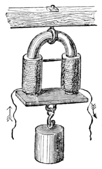 Fig. 9.97. In the next place, the current is able, not merely to deflect a magnet, but also to render soft iron magnetic. Let us take, for instance, the wire connected with the one pole of the battery, and cover it with thread, in order to insulate it, and let us wrap this wire round a cylinder of soft iron, as in Fig. 9. If we now make a communication between the other extremity of the wire, and the other pole of the battery, so as to make the current pass, it will be found that our cylinder of soft iron has become a powerful magnet, and that if an iron keeper be attached to it as in the figure, the keeper will be able to sustain a very great weight.
