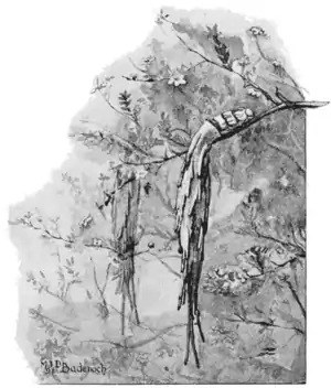 the male pupa becomes endowed with the power of stretching out its segments, to enable it to work its way out of the extremity. Through the opening of the posterior end it pushes the anterior half of its length, by a slight elongation and contraction of the body, which, with the assistance of a transverse series of minute sharp spines or hooks, directed backward, on some of the •segments, is in this way forced out head foremost, in like manner as the pupæ of the goat moths and the large swifts are made to emerge from timber and the earth when the moth is ready to escape. The pupæ are prevented from being thrust entirely out of the case by two strong anal hooks. After the issue of the imago the segments remain in their stretched-out condition; cases having belonged to males are often seen with the empty pupa skin sticking rather more than half out of the lower aperture, hanging head downward, as left by the moth.
