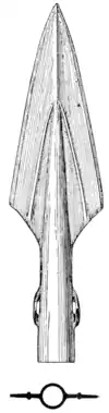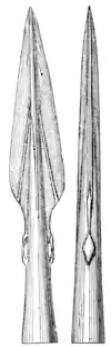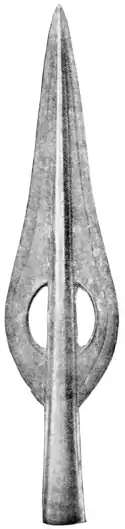 and elsewhere in Europe, though our specimens are perhaps the most beautifully proportioned, and gracefully though simply decorated. The loops are replaced by lunate openings, mainly for ornament, though they served also to lighten the spear without seriously reducing the strength.