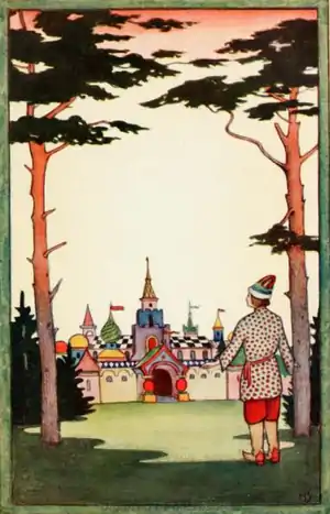 The boy watched all this in surprise, and then continued his way. Leaving the forest, he came upon a large garden in the midst of which stood a lofty palace with a golden roof. At the gate stood his godfather, smiling. He welcomed his godson, and led him through the gateway into the garden. The boy had never dreamed of such beauty and delight as surrounded him in that place.