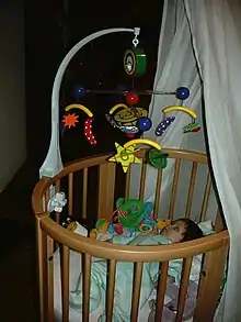 - a mobile, a sculpture or decorative arrangement made of hanging items syn.