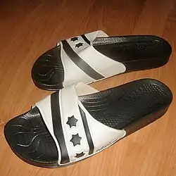 - (usually in the plural) slipper (low, soft shoe easily slipped in and out, intended for indoors use)