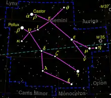 - (astronomy) A constellation of the zodiac supposedly shaped like a pair of twins. It contains the stars Castor and Pollux.