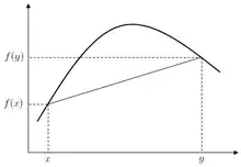 - (functional analysis, not comparable, of a real-valued function on the reals) satisfying the property that all segments connecting two points on the function's graph lie below the function.