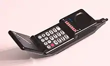 - A mobile telephone with a hinged top that is flipped open when the phone is in use.
