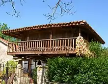 - granary, especially an isolated, rectangular, wooden or rock building supported by columns, characteristic of Asturias and typically used to store grain or other agricultural produce.