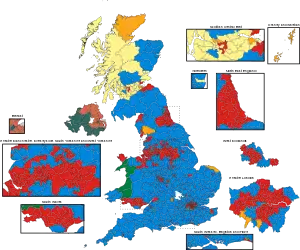 A map showing the results of the United Kingdom general election, 2017, which led to a hung parliament. Constituencies in blue are those won by the Conservative Party (48.8% of all parliamentary seats), those in red by the Labour Party (40.2%), and those in yellow by the Scottish National Party (5.4%). (Click on the image for a full legend.)