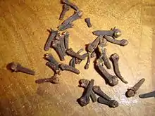 From New Latin caryophyllus, from Ancient Greek καρυόφυλλον (karuóphullon), from κάρυον (káruon, “nut”) + φύλλον (phúllon, “leaf”); the definition is a phono-semantic adaption from a Semitic language (compare Arabic قَرَنْفُل (qaranful)). Cognates include Italian garofano, French girofle, Greek γαρύφαλλο (garýfallo), Romanian calomfir (“costmary”).