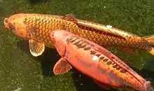 - Ornamental domesticated varieties of the common carp (Cyprinus carpio), of Japan and eastern Asia with red-gold or white coloring.