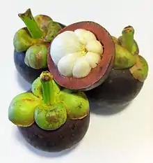 - (more specifically) A tropical fruit of the tree Garcinia mangostana.