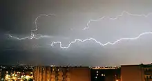 - lightning (flash of light caused by the discharge of atmospheric electrical charge)